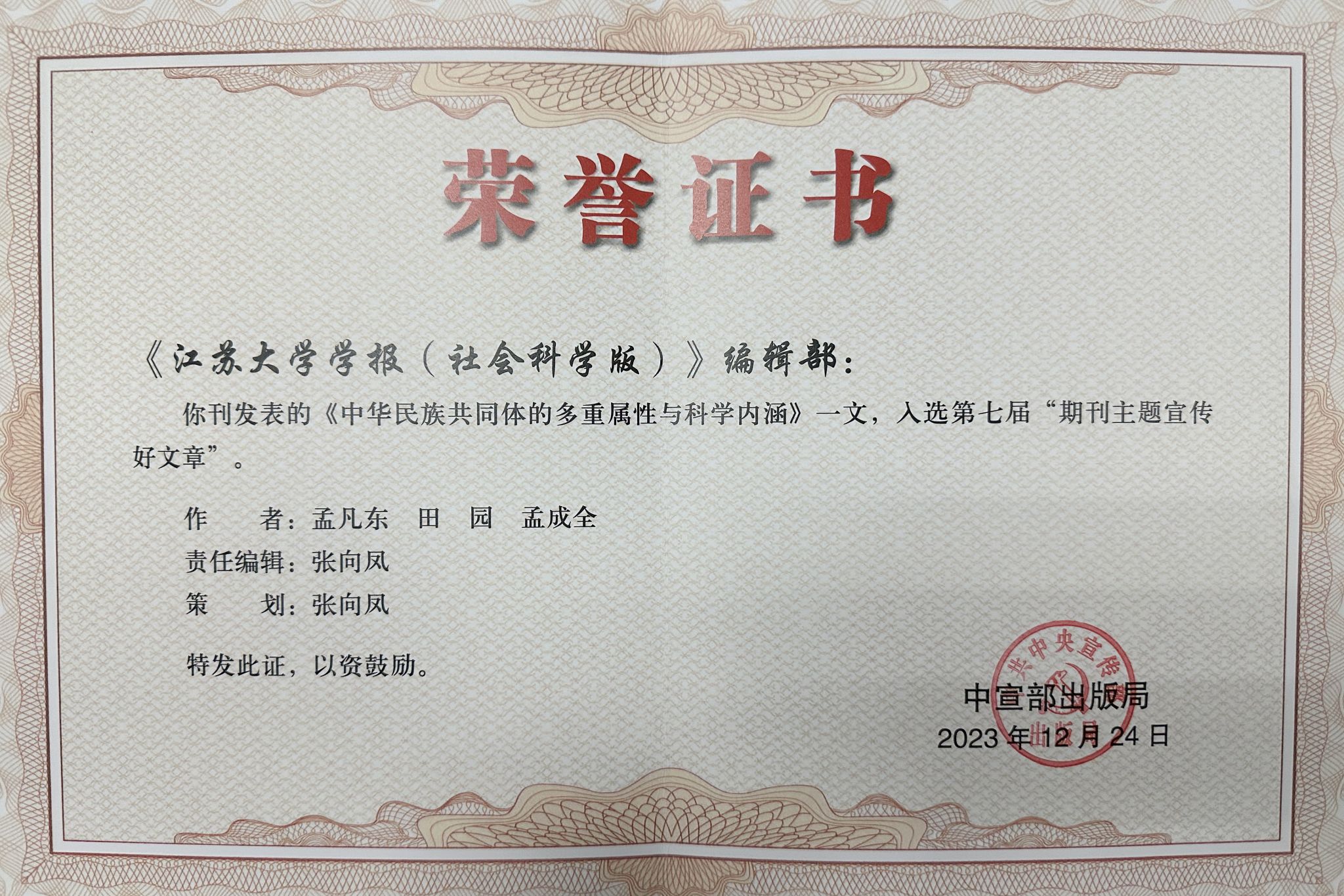 近日,第七屆“期刊主題宣傳好文章”推薦活動結果揭曉。《江蘇大學學報(社會科學版)》發表的《中華民族共同體的多重屬性和科學內涵》入選。