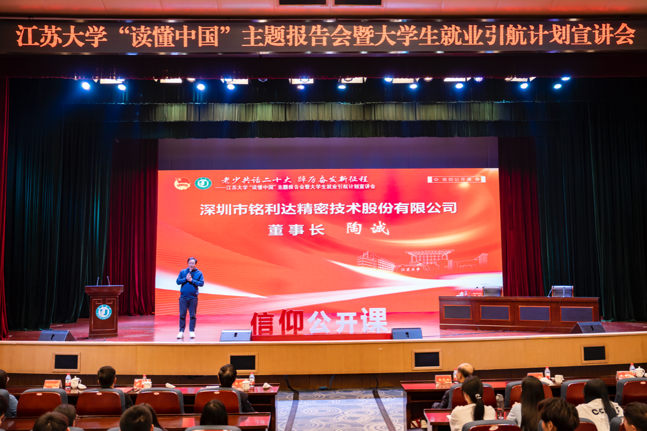 5月8日,“讀懂中國”主題報告會暨大學生就業引航計劃宣講會在校本部小禮堂舉行。校長顏曉紅,校關工委常務副主任柴順根,學校熱加工93級校友、深圳市銘利達精密技術股份有限公司董事長陶誠,機械制造及自動化專業97級校友、深圳市聯發科網絡技術有限公司董事長兼總經理黃興華,校友會、團委、計算機學院相關同志及學生代表近千人參加活動。計算機學院院長毛啟容主持客座教授聘任儀式,外聯辦主任任澤中主持主題報告會。