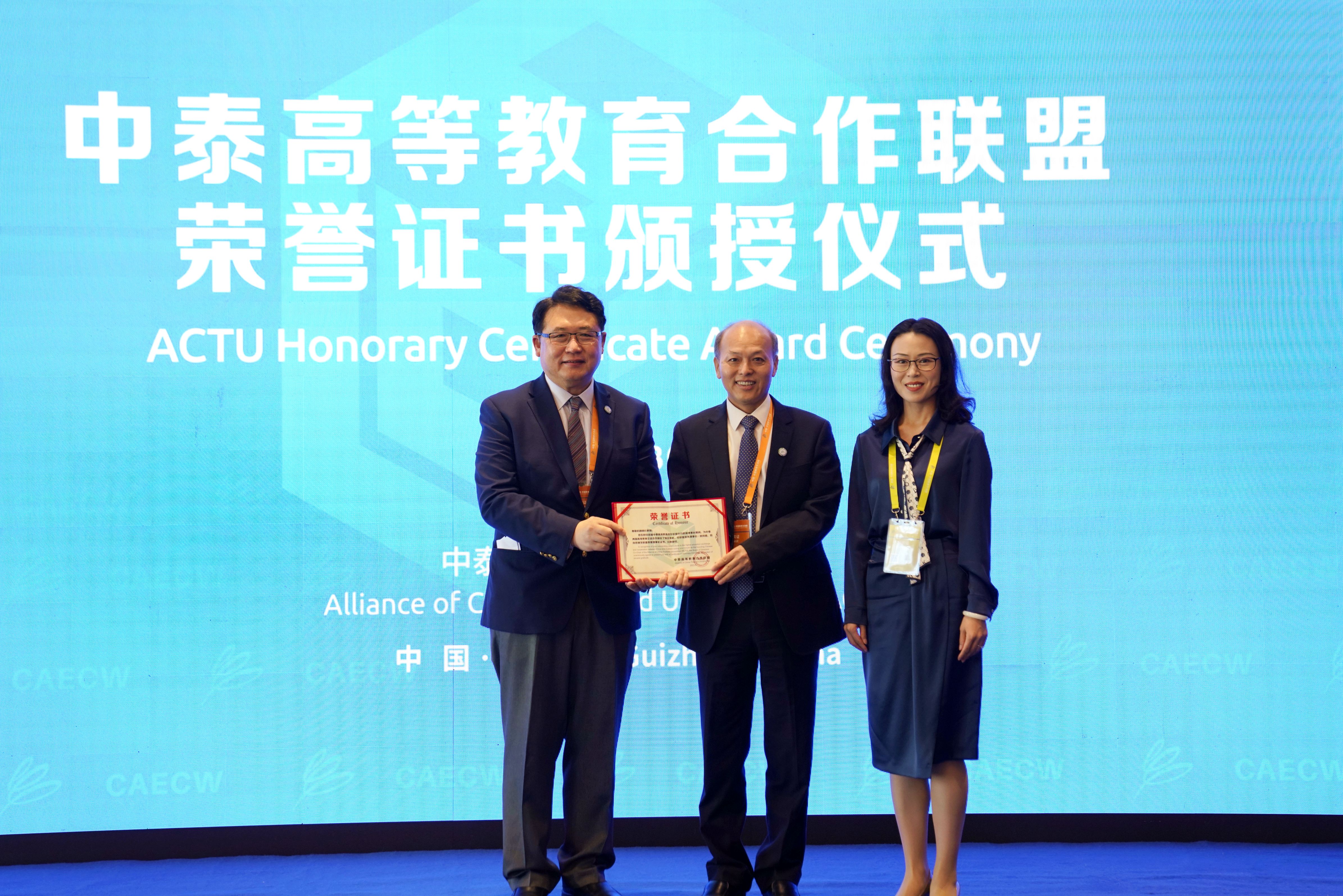 在中泰高等教育合作聯盟首任中方聯席理事長榮譽證書頒發儀式上,中泰高等教育合作聯盟首屆中方聯席理事長顏曉紅教授獲頒聯盟榮譽理事長證書。