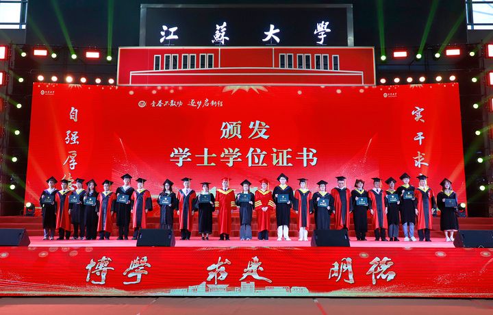 上午10時,2025屆博士生、碩士生、本科生代表依次登上主席臺。學校領導及黨委常委為他們一一頒發學位證書、扶正流蘇。江蘇大學黨委書記李洪波為優秀畢業生代表頒發榮譽證書。